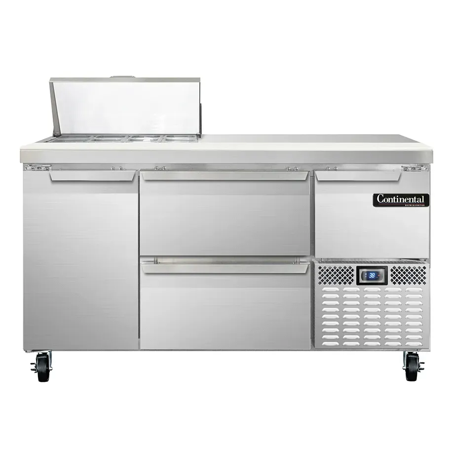 Transform your food service with the Continental Refrigerator RA60N8-D Refrigerated Counter, Sandwich / Salad Unit. This top-of-the-line unit is designed to meet the demands of a busy commercial restaurant. With its 300 series stainless steel top and stainless steel front and sides, this unit is not only durable but also easy to clean, ensuring a hygienic food preparation environment. The unit features (8) 1/6 size x 4" deep non-recessed pans, allowing you to store a variety of ingredients for sandwiches and salads. The (2) drawers provide additional storage space, with the top drawer holding (1) 12" x 20" pan and (3) 1/6 pans, and the bottom drawer holding (2) 12" x 20" pans. The 12" deep nylon cutting board provides a convenient workspace for food preparation. With its electronic controller and digital display, you can easily monitor and adjust the temperature to ensure food safety. The side-mounted refrigeration system ensures efficient cooling while maximizing storage space. Made in the USA and certified by cETLus and NSF, this Continental Refrigerator unit is a reliable and high-quality addition to any commercial kitchen.