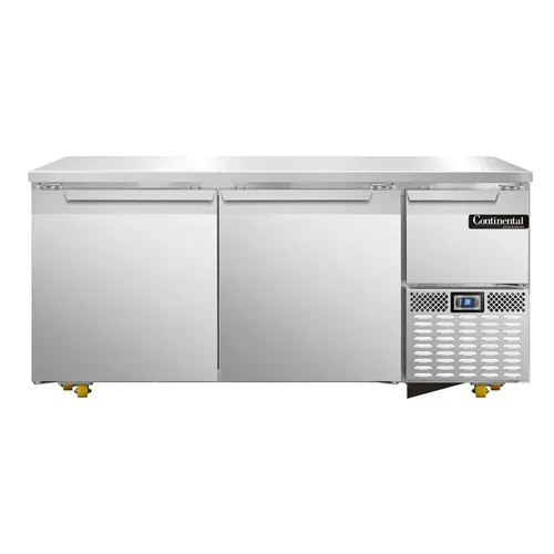 Achieve kitchen supremacy with the Continental Refrigerator RA68N-U Undercounter Refrigerated Base. This top-of-the-line refrigerator is designed to meet the demanding needs of commercial restaurants. With its stainless steel front and end panels, as well as a stainless steel top, this unit not only looks sleek but is also built to withstand the rigors of a busy kitchen. The aluminum interior provides excellent insulation and durability. The RA68N-U features two full-height and one half-height field rehingeable doors, allowing for easy access to your ingredients. The electronic controller with a digital display ensures precise temperature control, while the front breathing, side-mounted refrigeration system maximizes space efficiency. With eight heavy-duty casters, this unit can be easily moved and installed wherever you need it. NSF and cETLus certified, this refrigerator is made in the USA and is a reliable addition to any commercial kitchen.