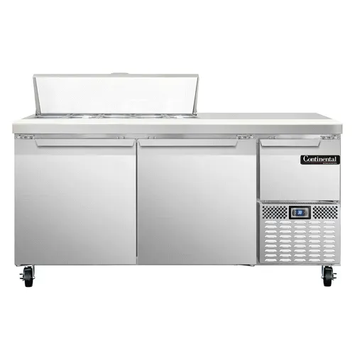 Revolutionize your cooking setup with the Continental Refrigerator RA68N10 Refrigerated Counter, Sandwich / Salad Unit. This top-of-the-line unit is designed to meet the demands of a busy commercial restaurant kitchen. The 68"W refrigerated base sandwich unit features a durable 300 series stainless steel top with 10 non-recessed pans, perfect for storing and organizing your ingredients. The stainless steel front and sides, along with the galvanized steel case back, ensure long-lasting durability in a high-traffic environment. Inside, the aluminum interior provides easy cleaning and maintenance. The unit also comes with a 12" deep nylon cutting board, allowing for convenient food preparation. With two full and one half height field rehingeable doors, you can easily access your ingredients while keeping them fresh. The electronic controller with a digital display allows for precise temperature control, ensuring your food stays at the optimal temperature. Powered by a 1/3 HP side-mounted refrigeration system, this unit is both efficient and reliable. NSF and cETLus certified, this sandwich/salad unit is made in the USA and is a must-have for any commercial restaurant.