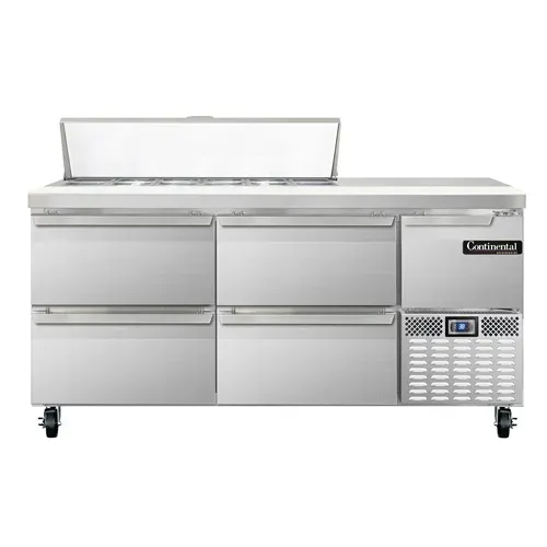 Cook with confidence using the Continental Refrigerator RA68N12-D Refrigerated Counter, Sandwich / Salad Unit. This top-of-the-line unit is designed to meet the demands of a busy commercial restaurant kitchen. With its 68" width and stainless steel construction, it offers ample space and durability for all your food preparation needs. The unit features a 300 series stainless steel top with 12 non-recessed pans, allowing you to easily organize and access your ingredients. The four drawers provide additional storage space, with the top drawers holding one 12" x 20" pan each and the bottom drawers holding two 12" x 20" pans each. The unit also includes a 12" deep nylon cutting board for convenient food preparation. With its electronic controller and digital display, you can easily monitor and adjust the temperature to ensure food safety. The side-mounted refrigeration system ensures efficient cooling, while the half-height field rehingeable door allows for easy access. Made in the USA and certified by cETLus and NSF, this Continental Refrigerator unit is a reliable and high-quality addition to any commercial kitchen.