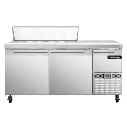 Introducing the Continental Refrigerator RA68N12, a refrigerated counter that is ready to dominate the culinary world. This sandwich/salad unit is designed to meet the demands of a commercial restaurant with its impressive features and top-notch quality. The 300 series stainless steel top comes with 12 non-recessed pans, allowing you to store and organize your ingredients efficiently. The stainless steel front and sides, along with the galvanized steel case back, ensure durability and longevity. Inside, you'll find an aluminum interior that is easy to clean and maintain. The unit also includes a 12" deep nylon cutting board, perfect for preparing sandwiches and salads. With two full and one half-height field rehingeable doors, accessing your ingredients has never been easier. The electronic controller with a digital display allows for precise temperature control, while the side-mounted refrigeration ensures optimal cooling. Made in the USA and certified by cETLus and NSF, the Continental Refrigerator RA68N12 is the ideal choice for any commercial restaurant looking to elevate their culinary game.