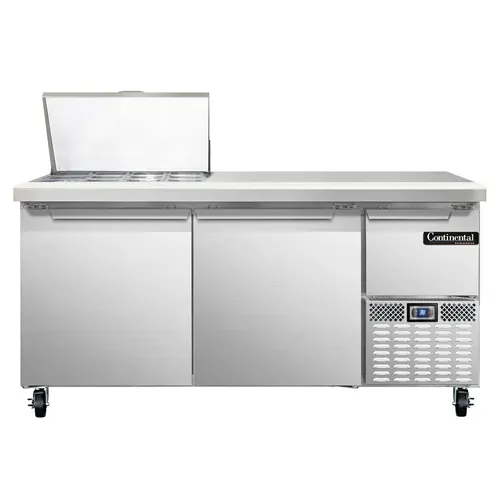 Fuel your restaurant's success with the Continental Refrigerator RA68N12M Refrigerated Counter, Mega Top Sandwich / Salad Unit. This top-of-the-line unit is designed to meet the demands of a busy commercial kitchen. With its 68" width and 300 series stainless steel top, it provides ample space for food preparation. The unit comes with 12 non-recessed pans, each 1/6 size and 4" deep, allowing you to store a variety of ingredients for sandwiches and salads. The stainless steel front and sides, along with the galvanized steel case back, ensure durability and easy cleaning. Inside, the aluminum interior is both hygienic and resistant to corrosion. The unit features a 10" deep nylon cutting board for convenient food preparation. The electronic controller with a digital display allows for precise temperature control, ensuring that your ingredients stay fresh. With its 1/3 HP side-mounted refrigeration system, this unit provides efficient cooling while saving valuable kitchen space. NSF and cETLus certified, this Made in USA product is a reliable choice for any commercial restaurant.