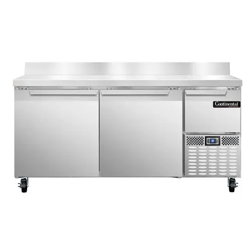 Empower your kitchen staff with the Continental Refrigerator RA68NBS Refrigerated Counter Work Top. This top-of-the-line unit is designed to meet the demands of a busy commercial restaurant kitchen. With its 68" width and stainless steel construction, it provides ample workspace and durability. The 5-1/2" high backsplash ensures that spills and splatters are contained, making cleanup a breeze. The electronic controller with a digital display allows for precise temperature control, ensuring that your ingredients stay fresh and safe. The unit features two full-height and one half-height field rehingeable doors, providing easy access to your stored items. The side-mounted refrigeration system maximizes storage space and keeps the unit running efficiently. Made in the USA and certified by cETLus and NSF, you can trust the quality and reliability of this refrigerated counter work top. Upgrade your kitchen with the Continental Refrigerator RA68NBS and experience the difference it makes in your restaurant's efficiency and productivity.