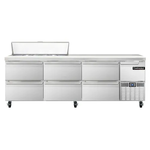 Elevate your cuisine with the Continental Refrigerator RA93N12-D Refrigerated Counter, Sandwich / Salad Unit. This top-of-the-line unit is designed to meet the demands of a busy commercial restaurant kitchen. With its 93" width and 300 series stainless steel top, it provides ample space for food preparation. The unit comes with 12 non-recessed pans, allowing you to store and organize your ingredients efficiently. The stainless steel front and sides, along with the galvanized steel case back, ensure durability and easy cleaning. Inside, you'll find an aluminum interior and a 12" deep nylon cutting board for added convenience. The unit features six drawers, with the top drawers holding one 12" x 20" pan each and the bottom drawers holding two 12" x 20" pans each. The half-height field rehingeable door and electronic controller with digital display make it easy to access and control the temperature. With its 1/2 HP side-mounted refrigeration system, this unit is both efficient and reliable. Made in the USA and certified by cETLus and NSF, the Continental Refrigerator RA93N12-D is the perfect addition to any commercial kitchen.