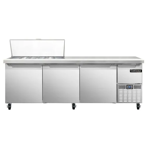 Unleash your kitchen's potential with the Continental Refrigerator RA93N18M Refrigerated Counter, Mega Top Sandwich / Salad Unit. This top-of-the-line unit is designed to meet the demands of a busy commercial restaurant. With its 93" width and 300 series stainless steel top, it provides ample space for food preparation and storage. The unit comes with 18 non-recessed pans, each 1/6 size and 4" deep, allowing you to organize and display your ingredients with ease. The stainless steel front and sides, along with the galvanized steel case back, ensure durability and longevity. Inside, the aluminum interior is easy to clean and maintain. The unit also features a 10" deep nylon cutting board, perfect for slicing and dicing. With three full and one half height field rehingeable doors, accessing your ingredients has never been easier. The electronic controller with digital display allows for precise temperature control, while the side-mounted refrigeration ensures efficient cooling. This NSF-certified unit is proudly made in the USA and is a must-have for any commercial kitchen.