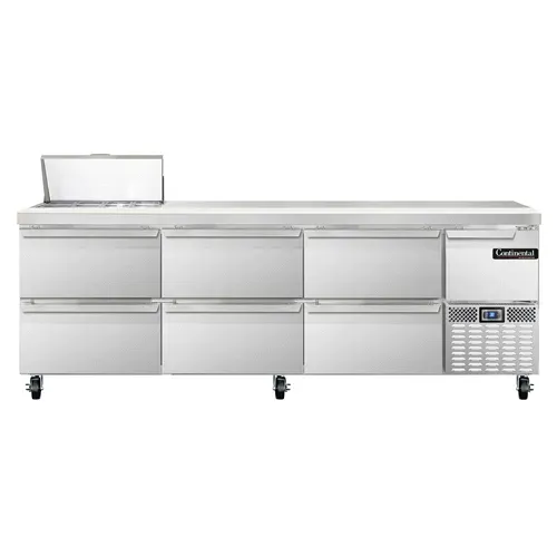 Elevate your cuisine with the Continental Refrigerator RA93N8-D Refrigerated Counter, Sandwich / Salad Unit. This top-of-the-line unit is designed to meet the demands of a busy commercial restaurant kitchen. With its 93" width and stainless steel construction, it offers ample space and durability for all your food preparation needs. The unit features a 300 series stainless steel top with eight non-recessed pans, allowing you to easily organize and access your ingredients. The six drawers provide additional storage space, with the top drawers holding one 12" x 20" pan each and the bottom drawers holding two 12" x 20" pans each. The 12" deep nylon cutting board is perfect for slicing and dicing, while the half-height field rehingeable door allows for easy access to stored items. With its electronic controller and side-mounted refrigeration, this unit ensures precise temperature control and efficient cooling. Made in the USA and certified by cETLus and NSF, the Continental Refrigerator RA93N8-D is a reliable and high-quality addition to any commercial kitchen.