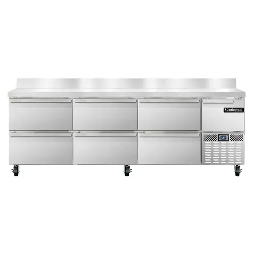 Transform your food service with the Continental Refrigerator RA93NBS-D Refrigerated Counter Work Top. This top-of-the-line unit is designed to meet the demands of a busy commercial restaurant. With its 93" width and stainless steel construction, it provides ample workspace and durability. The 5-1/2" backsplash ensures a clean and sanitary environment, while the galvanized steel rear and grill add extra strength. Inside, you'll find six drawers that can hold two 12 x 20 x 6 pans each, allowing for efficient organization and easy access to ingredients. The half-height field rehingeable door provides convenience and flexibility. The electronic controller with a digital display allows for precise temperature control, ensuring that your food stays fresh and safe. With its side-mounted refrigeration and 1/3 HP motor, this unit is both efficient and reliable. Made in the USA and certified by cETLus and NSF, the Continental Refrigerator RA93NBS-D is the perfect addition to any commercial kitchen.