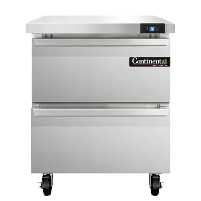 Unleash culinary creativity with the Continental Refrigerator SW27N-D Refrigerated Counter. This work top refrigerator is designed to meet the demands of a busy commercial restaurant kitchen. With a 27" width and a 7.4 cu ft capacity, it provides ample space for storing ingredients and prepared dishes. The stainless steel flat top is not only durable but also easy to clean, making it perfect for food preparation. The two drawers can accommodate a 12 x 20 x 6 pan each, allowing for efficient organization and easy access to ingredients. The electronic control with a digital display ensures precise temperature control, while the hi-low alarm alerts you if the temperature goes outside the desired range. Made in the USA, this refrigerator is cETLus and NSF certified, guaranteeing its quality and safety. Upgrade your kitchen with the Continental Refrigerator SW27N-D and experience the convenience and reliability it offers.