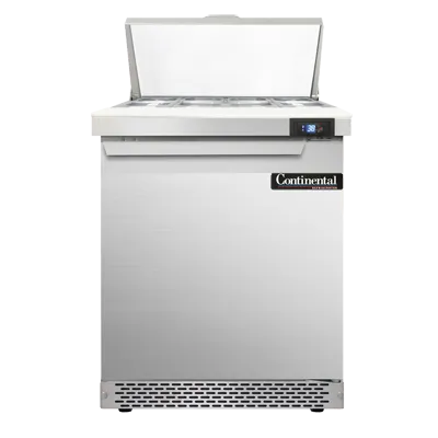 Culinary artistry redefined with the Continental Refrigerator SW27N8-FB Refrigerated Counter, Sandwich / Salad Unit. This one-section sandwich unit is designed to meet the demands of a commercial restaurant, offering a spacious 7.4 cu ft capacity and (8) 1/6 size x 4" deep pans with a 12" cutting board for efficient food preparation. The stainless steel top, front, and end panels ensure durability and easy cleaning, while the aluminum back and interior provide excellent insulation. With a field rehingeable door and rear-mounted self-contained refrigeration, this unit offers flexibility and convenience. The electronic control with a digital display and hi-low alarm allows for precise temperature management, ensuring food safety. Equipped with 3-3/4" casters, this sandwich unit is easy to move and position in any kitchen layout. Made in the USA and certified by cETLus and NSF, the Continental Refrigerator SW27N8-FB is the perfect addition to any commercial restaurant seeking to elevate their culinary creations.