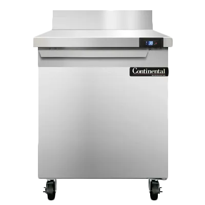 Cook with confidence and flair with the Continental Refrigerator SW27NBS Refrigerated Counter. This work top refrigerator is designed to meet the demands of a busy commercial restaurant kitchen. With a 27" width and a 7.4 cu ft capacity, it provides ample space for storing ingredients and prepared dishes. The stainless steel top with a 5-1/2"H backsplash ensures durability and easy cleaning, while the field rehingeable door allows for convenient access. The electronic control with a digital display and hi-low alarm ensures precise temperature control and alerts you if there are any issues. The rear mounted self-contained refrigeration system and R290 Hydrocarbon refrigerant guarantee efficient cooling while being environmentally friendly. Made in the USA and certified by cETLus and NSF, this work top refrigerator is a reliable and high-quality addition to any commercial kitchen.