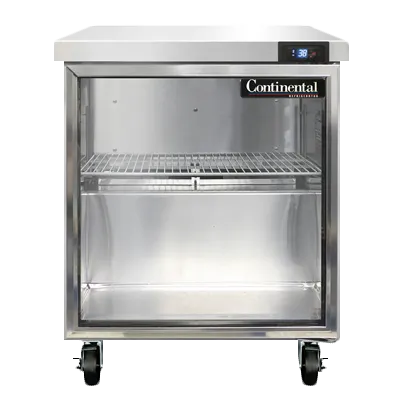 Cook with confidence and flair with the Continental Refrigerator SW27NGD Refrigerated Counter. This work top display refrigerator is designed to meet the needs of commercial restaurants, offering a spacious 7.4 cu ft capacity in a compact 27" size. The stainless steel flat top provides a durable and easy-to-clean surface, while the glass door allows for easy visibility of the contents. LED interior lighting illuminates the interior, making it easy to find what you need. The electronic control with digital display allows for precise temperature control, and the hi-low alarm ensures that you are alerted if the temperature goes outside of the desired range. With rear mounted self-contained refrigeration and R290 Hydrocarbon refrigerant, this refrigerator is both efficient and environmentally friendly. Made in the USA and certified by cETLus and NSF, you can trust the quality and reliability of Continental Refrigerator. Upgrade your restaurant's refrigeration with the SW27NGD Refrigerated Counter.