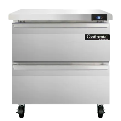Master the art of flavor with the Continental Refrigerator SW32N-D Refrigerated Counter. This work top refrigerator is designed to meet the demands of a busy commercial restaurant kitchen. With a spacious 9.0 cu ft capacity and a one-section layout, it provides ample storage space for your ingredients and prepared dishes. The stainless steel flat top not only adds a sleek and professional look to your kitchen, but it also serves as a convenient workspace. The two drawers are designed to accommodate various pan sizes, allowing for versatile storage options. The electronic control with a digital display ensures precise temperature management, while the hi-low alarm alerts you of any temperature fluctuations. Made in the USA with high-quality materials, this refrigerator is built to last. Upgrade your kitchen with the Continental Refrigerator SW32N-D and elevate your culinary creations to new heights.