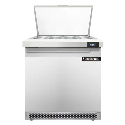 Serve with pride with the Continental Refrigerator SW32N12M-FB Refrigerated Counter, Mega Top Sandwich / Salad Unit. This mighty top sandwich unit is designed to meet the demands of a busy commercial restaurant. With its spacious 32" width and one-section design, it offers ample storage and preparation space for your sandwiches and salads. The unit comes with (12) 1/6 size x 4" deep pans and a 10" cutting board, allowing you to easily assemble and customize your dishes. The stainless steel top, front, and end panels ensure durability and easy cleaning, while the aluminum back and interior provide excellent insulation. The electronic control with a digital display and hi-low alarm allows for precise temperature management, ensuring your ingredients stay fresh and safe. With its rear-mounted self-contained refrigeration and 1/5 hp compressor, this unit is both efficient and reliable. Made in the USA and certified by cETLus and NSF, the Continental Refrigerator SW32N12M-FB is the perfect addition to any commercial kitchen.
