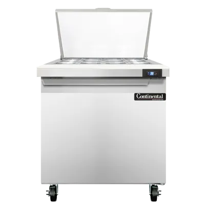 Experience kitchen innovation with the Continental Refrigerator SW32N12M Refrigerated Counter, Mega Top Sandwich / Salad Unit. This mighty top sandwich unit is designed to meet the demands of a busy commercial restaurant. With a spacious 32" width and a generous 9.0 cu ft capacity, it provides ample storage for all your ingredients. The unit features a one-section design with 12 1/6 size x 4" deep pans and a convenient 10" cutting board, allowing you to easily assemble sandwiches and salads. The stainless steel top, front, and end panels ensure durability and easy cleaning, while the aluminum back and interior provide excellent insulation. The electronic control with a digital display allows for precise temperature management, and the hi-low alarm ensures food safety. With rear-mounted self-contained refrigeration and a 1/5 hp compressor, this unit is both efficient and reliable. Made in the USA and certified by cETLus and NSF, the Continental Refrigerator SW32N12M is the perfect addition to any commercial kitchen.