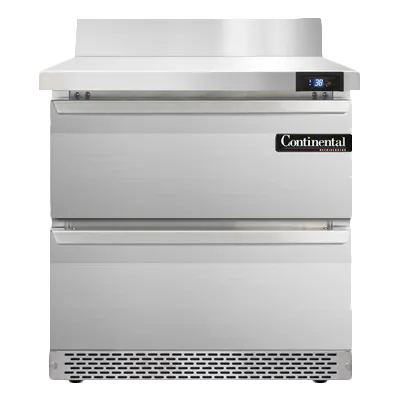 Cook with precision using the Continental Refrigerator SW32NBS-FB-D Refrigerated Counter. This work top refrigerator is designed to meet the demands of a commercial restaurant kitchen. With a 9.0 cu ft capacity and a one-section layout, it offers ample space for storing ingredients and prepared dishes. The stainless steel top with a 5-1/2"H backsplash provides a hygienic and easy-to-clean surface, while the (2) drawers can accommodate (1) 12 x 20 x 6 pan per drawer or (1) 1/2 x 6 pan & (2) 1/3 x 6 pans per drawer capacity. The stainless steel front and end panels ensure durability and a sleek appearance. Equipped with an electronic control with a digital display and a hi-low alarm, this refrigerator allows for precise temperature management and monitoring. The rear mounted self-contained refrigeration system, powered by a 1/5 hp motor and using R290 Hydrocarbon refrigerant, ensures efficient cooling. With its cETLus and NSF certifications, this Continental Refrigerator is a reliable and safe choice for any commercial kitchen. Made in the USA, this work top refrigerator is a valuable addition to any restaurant seeking quality and performance.
