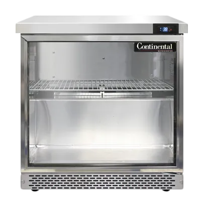 Introducing the Continental Refrigerator SW32NGD-FB Refrigerated Counter, Work Top. Craft culinary wonders with this top-of-the-line work top display refrigerator. Designed by Continental Refrigerator, a trusted name in commercial refrigeration, this model is perfect for commercial restaurant use. With a spacious 9.0 cu ft capacity and a stainless steel flat top, it provides ample space for food preparation while maintaining a sleek and professional appearance. The glass door and LED interior lighting allow for easy visibility and accessibility to your ingredients. The electronic control with digital display and hi-low alarm ensure precise temperature control and food safety. The rear-mounted self-contained refrigeration system and R290 Hydrocarbon refrigerant guarantee efficient cooling and environmental friendliness. Made in the USA and certified by cETLus and NSF, this work top refrigerator is a reliable and durable addition to any commercial kitchen. Don't compromise on quality, choose the Continental Refrigerator SW32NGD-FB for your restaurant today.