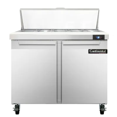 Master the art of cooking with the Continental Refrigerator SW36N10C Refrigerated Counter, Sandwich / Salad Unit. This two-section sandwich unit is designed to meet the needs of commercial restaurants, offering a spacious 10.3 cu ft capacity to store all your ingredients. With (10) 1/6 size x 4" deep pans and a 19" cutting board, you'll have plenty of space to prepare sandwiches and salads efficiently. The unit features field rehingeable doors, allowing for easy customization to suit your kitchen layout. Made in the USA, this sandwich unit boasts a durable stainless steel top, front, and end panels, as well as an aluminum back and interior. The electronic control with a digital display ensures precise temperature management, while the hi-low alarm alerts you to any fluctuations. With rear-mounted self-contained refrigeration and a 1/5 hp compressor, this sandwich unit is both efficient and reliable. Trust Continental Refrigerator to deliver high-quality refrigeration solutions for your commercial kitchen.
