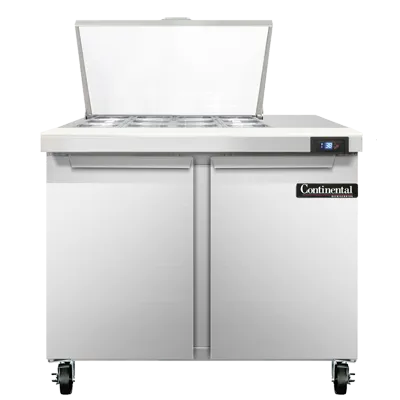 Boost your restaurant's performance with the Continental Refrigerator SW36N12M Refrigerated Counter, Mega Top Sandwich / Salad Unit. This mighty top sandwich unit is designed to meet the demands of a busy commercial kitchen. With a spacious 36" width and a generous 10.3 cu ft capacity, it provides ample storage for all your ingredients. The unit features two sections, each equipped with 12 1/6 size x 4" deep pans and a convenient 10" cutting board, allowing for efficient food preparation. The stainless steel top, front, and end panels ensure durability and easy cleaning, while the aluminum back and interior provide excellent insulation. The electronic control with a digital display allows for precise temperature management, and the hi-low alarm ensures food safety. With rear-mounted self-contained refrigeration and a 1/5 hp compressor, this unit is both efficient and reliable. Made in the USA and certified by cETLus and NSF, the Continental Refrigerator SW36N12M is the perfect addition to any commercial restaurant.