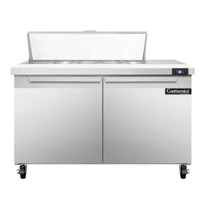 Introducing the Continental Refrigerator SW48N10 Refrigerated Counter, Sandwich / Salad Unit. Dominate the culinary world with this top-of-the-line sandwich unit that is designed to meet the needs of commercial restaurants. With a spacious 48" width and a generous 13.4 cu ft capacity, this two-section unit provides ample storage space for all your ingredients. It comes equipped with (10) 1/6 size x 4" deep pans and a 12" cutting board, allowing you to easily assemble sandwiches and salads with precision. The stainless steel top, front, and end panels ensure durability and easy cleaning, while the aluminum back and interior provide excellent insulation. The electronic control with a digital display allows for precise temperature management, and the hi-low alarm ensures food safety. With rear-mounted self-contained refrigeration and a 1/5 hp compressor, this unit is both efficient and reliable. Made in the USA and certified by cETLus and NSF, the Continental Refrigerator SW48N10 is the perfect addition to any commercial kitchen.