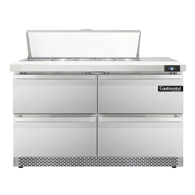 Cook with precision using the Continental Refrigerator SW48N10C-FB-D Refrigerated Counter, Sandwich / Salad Unit. This top-of-the-line unit is designed to meet the demands of a busy commercial restaurant kitchen. With a 48" width and a 13.4 cu ft capacity, it offers ample space for all your ingredients and supplies. The unit features two sections, each equipped with 10 1/6 size x 4" deep pans and a 19" cutting board for efficient food preparation. Additionally, it comes with four drawers that can accommodate either a 12 x 18 x 6 pan or a combination of a 1/2 x 6 pan and a 1/3 x 6 pan. The stainless steel top, front, and end panels ensure durability and easy cleaning, while the aluminum back and interior provide excellent insulation. The electronic control with a digital display allows for precise temperature management, and the hi-low alarm ensures food safety. With rear-mounted self-contained refrigeration and 3-3/4" casters, this unit is both convenient and mobile. Trust Continental Refrigerator for quality and reliability - this NSF-certified unit is proudly made in the USA.