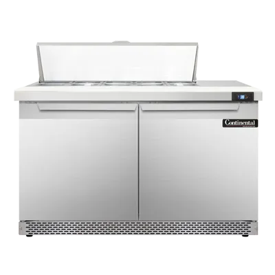Transform your food service with the Continental Refrigerator SW48N10C-FB Refrigerated Counter, Sandwich / Salad Unit. This top-of-the-line unit is designed to meet the demands of a busy commercial restaurant. With a 48" width and a 13.4 cu ft capacity, it provides ample space for all your sandwich and salad ingredients. The unit features two sections, each equipped with 10 1/6 size x 4" deep pans and a 19" cutting board, allowing for efficient food preparation. The stainless steel top, front, and end panels ensure durability and easy cleaning, while the aluminum back and interior provide excellent insulation. The electronic control with a digital display allows for precise temperature management, and the hi-low alarm ensures food safety. With rear-mounted self-contained refrigeration and 3-3/4" casters, this unit is easy to move and position in your kitchen. Made in the USA and certified by cETLus and NSF, you can trust the quality and reliability of this Continental Refrigerator. Upgrade your restaurant's food preparation capabilities with this exceptional refrigerated counter.