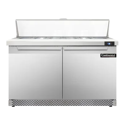 Invest in superior quality with the Continental Refrigerator SW48N12-FB Refrigerated Counter, Sandwich / Salad Unit. This two-section sandwich unit is designed to meet the demands of a busy commercial restaurant. With a 48" width and a 13.4 cu ft capacity, it provides ample space for storing and preparing sandwiches and salads. The unit comes with (12) 1/6 size x 4" deep pans and a 12" cutting board, allowing for efficient ingredient organization and food preparation. The stainless steel top, front, and end panels ensure durability and easy cleaning, while the aluminum back and interior provide excellent insulation. The electronic control with a digital display allows for precise temperature management, and the hi-low alarm ensures food safety. With rear-mounted self-contained refrigeration and 3-3/4" casters, this sandwich unit is easy to move and position in your restaurant. Invest in the Continental Refrigerator SW48N12-FB and elevate your restaurant's efficiency and productivity.