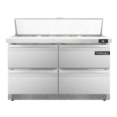 Fuel your restaurant's success with the Continental Refrigerator SW48N12C-FB-D Refrigerated Counter, Sandwich / Salad Unit. This top-of-the-line unit is designed to meet the demanding needs of a commercial restaurant. With a spacious 48" width and a 13.4 cu ft capacity, it offers ample storage space for all your ingredients. The unit features two sections, each equipped with four drawers that can accommodate various pan sizes. The 19" cutting board provides a convenient workspace for food preparation. Made in the USA, this sandwich unit is built to last with its stainless steel top, front, and end panels, as well as its aluminum back and interior. The electronic control with a digital display allows for precise temperature management, while the hi-low alarm ensures food safety. With rear-mounted self-contained refrigeration and 3-3/4" casters, this unit is easy to move and position in your kitchen. Trust Continental Refrigerator for reliable and efficient refrigeration solutions.