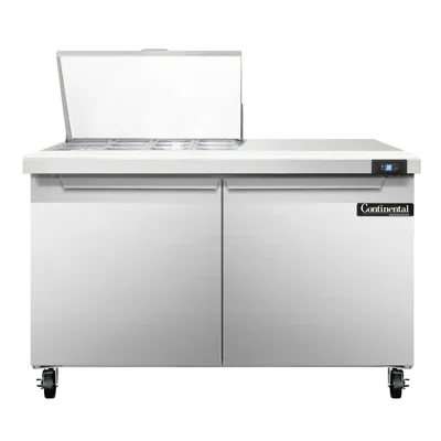 Deliver food perfection with the Continental Refrigerator SW48N12M Refrigerated Counter, Mega Top Sandwich / Salad Unit. This mighty top sandwich unit is designed to meet the demands of a busy commercial restaurant. With a spacious 48" width and a generous 13.4 cu ft capacity, it provides ample storage for all your ingredients. The unit features two sections, each equipped with 12 1/6 size x 4" deep pans and a convenient 10" cutting board, allowing for efficient food preparation. The stainless steel top, front, and end panels ensure durability and easy cleaning, while the aluminum back and interior provide excellent insulation. The electronic control with a digital display allows for precise temperature management, and the hi-low alarm ensures food safety. With rear-mounted self-contained refrigeration and a 1/5 hp compressor, this unit delivers reliable cooling performance. Made in the USA and certified by cETLus and NSF, the Continental Refrigerator SW48N12M is the perfect addition to any commercial kitchen.