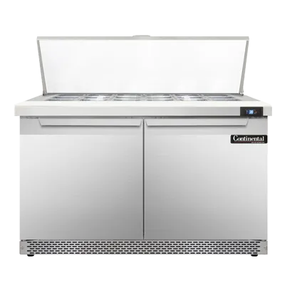 Unleash gastronomic brilliance with the Continental Refrigerator SW48N18M-FB Refrigerated Counter, Mega Top Sandwich / Salad Unit. This mighty top sandwich unit is designed to meet the demands of a busy commercial restaurant. With a 48" width and a 13.4 cu ft capacity, it offers ample space to store and prepare ingredients for your signature sandwiches and salads. The unit features two sections, each equipped with 18 1/6 size x 4" deep pans and a convenient 10" cutting board. The stainless steel top, front, and end panels ensure durability and easy cleaning, while the aluminum back and interior provide excellent insulation. The electronic control with a digital display allows for precise temperature management, and the hi-low alarm ensures food safety. With rear-mounted self-contained refrigeration and 3-3/4" casters, this unit is both efficient and mobile. Made in the USA and certified by cETLus and NSF, the Continental Refrigerator SW48N18M-FB is the perfect addition to any commercial kitchen.