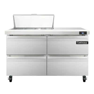 Achieve culinary excellence with the Continental Refrigerator SW48N8C-D Refrigerated Counter, Sandwich / Salad Unit. This top-of-the-line unit is designed to meet the demands of a busy commercial restaurant kitchen. With a spacious 48" width and a generous 13.4 cu ft capacity, this two-section sandwich unit provides ample storage space for all your ingredients. It comes equipped with eight 1/6 size pans, each 4" deep, along with a convenient 19" cutting board for easy food preparation. The unit also features four drawers, each capable of accommodating a 12 x 18 x 6 pan or a combination of 1/2 x 6 and 1/3 x 6 pans. Made in the USA, this sandwich unit boasts a durable stainless steel top, front, and end panels, as well as an aluminum back and interior. The electronic control with a digital display allows for precise temperature management, while the hi-low alarm ensures food safety. The rear-mounted self-contained refrigeration system, powered by a 1/5 hp motor, guarantees efficient cooling. Trust Continental Refrigerator for reliable, NSF-certified equipment that will elevate your restaurant's efficiency and productivity.