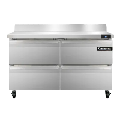 Introducing the Continental Refrigerator SW48NBS-D Refrigerated Counter, Work Top - the perfect addition to drive restaurant profitability. This two-section work top refrigerator offers a spacious 48"W and a generous 13.4 cu ft capacity, providing ample storage for your ingredients and supplies. With its stainless steel top and 5-1/2"H backsplash, this unit ensures durability and easy cleaning, while the four drawers offer convenient organization. Each drawer can accommodate either a 12 x 18 x 6 pan or a combination of a 1/2 x 6 pan and a 1/3 x 6 pan, allowing for versatile storage options. The stainless steel front and end panels, along with the aluminum interior, guarantee longevity in a busy restaurant environment. Equipped with electronic control and a digital display, this work top refrigerator offers precise temperature management. The hi-low alarm ensures food safety, while the rear mounted self-contained refrigeration system and R290 Hydrocarbon refrigerant provide efficient cooling. Made in the USA and certified by cETLus and NSF, this Continental Refrigerator is a reliable choice for any commercial kitchen.