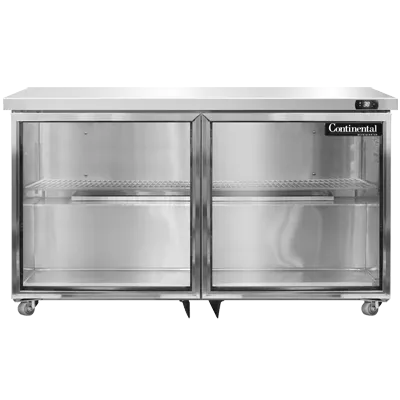 Achieve culinary excellence with the Continental Refrigerator SW48NGD-U Undercounter Display Refrigerator. This top-of-the-line refrigerator is designed to meet the needs of commercial restaurants, offering a spacious 48"W and a generous 13.4 cu ft capacity. The two-section design features two glass doors, allowing for easy visibility and access to your ingredients. The LED lighting illuminates the interior, making it effortless to locate items even in low-light conditions. With its stainless steel front, top, and end panels, as well as an aluminum interior, this refrigerator is built to withstand the demands of a busy kitchen. The front breathing design and rear-mounted self-contained refrigeration ensure efficient cooling and temperature control. The electronic control with a digital display, along with the hi-low alarm, provides precise monitoring and alerts. Made in the USA and certified by cETLus and NSF, this Continental Refrigerator is a reliable and high-quality addition to any commercial kitchen.