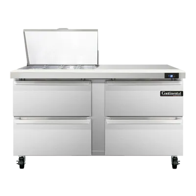 Introducing the Continental Refrigerator SW60N12M-D Refrigerated Counter, Mega Top Sandwich / Salad Unit. Dominate the culinary world with this powerful and versatile addition to your commercial kitchen. With a spacious 17.0 cu ft capacity and two-section design, this mighty top sandwich unit is perfect for storing and preparing a wide variety of ingredients. It comes equipped with twelve 1/6 size pans, each 4" deep, and a convenient 10" cutting board for efficient food prep. The four drawers can accommodate a 12 x 20 x 6 pan each (supplied by others), providing ample storage space. Made in the USA, this unit features a stainless steel top, front, and end panels, as well as an aluminum back and interior for durability. The electronic control with a digital display and hi-low alarm ensures precise temperature management. With rear-mounted self-contained refrigeration and a 1/4 HP compressor, this unit is both efficient and reliable. Trust Continental Refrigerator to deliver exceptional quality and performance for your restaurant needs.