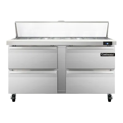 Introducing the Continental Refrigerator SW60N16C-D Refrigerated Counter, Sandwich / Salad Unit, designed to dominate the culinary world. This two-section sandwich unit boasts a spacious 17.0 cu ft capacity, perfect for commercial restaurant use. With its 16 1/6 size x 4" deep pans and a 19" cutting board, you'll have ample space to prepare and store your ingredients. The unit also features four drawers that can accommodate a 12 x 20 x 6 pan each (supplied by others), providing convenient storage options. Made in the USA, this sandwich unit is built to last, with stainless steel top, front, and end panels, as well as aluminum back and interior. The electronic control with a digital display allows for precise temperature management, while the hi-low alarm ensures food safety. With rear-mounted self-contained refrigeration and a 1/4 HP compressor, this unit delivers efficient cooling performance. Trust Continental Refrigerator to elevate your restaurant's efficiency and productivity.