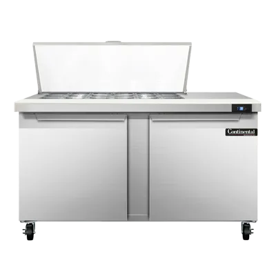 Culinary artistry redefined with the Continental Refrigerator SW60N18M Refrigerated Counter, Mega Top Sandwich / Salad Unit. This mighty top sandwich unit is designed to meet the demands of a busy commercial restaurant. With a spacious 60" width and a generous 17.0 cu ft capacity, it provides ample storage for all your ingredients. The unit features two sections, each equipped with 18 1/6 size x 4" deep pans and a convenient 10" cutting board, allowing for efficient food preparation. The stainless steel top, front, and end panels ensure durability and easy cleaning, while the aluminum back and interior provide excellent insulation. The electronic control with a digital display allows for precise temperature management, and the hi-low alarm ensures food safety. With rear-mounted self-contained refrigeration and a 1/4 HP compressor, this unit is both efficient and reliable. Made in the USA and certified by cETLus and NSF, the Continental Refrigerator SW60N18M is the perfect addition to any commercial kitchen.