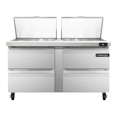 Boost your restaurant's performance with the Continental Refrigerator SW60N24M-D Refrigerated Counter, Mega Top Sandwich / Salad Unit. This powerful unit is designed to meet the demands of a busy commercial kitchen, offering a spacious 17.0 cu ft capacity and two sections for efficient organization. With 24 1/6 size pans and a 10" cutting board, you'll have plenty of space to prepare and store your ingredients. The four drawers can accommodate a 12 x 20 x 6 pan each, allowing for easy access and convenient storage. Made in the USA, this unit features a stainless steel top, front, and end panels, as well as an aluminum back and interior for durability and easy cleaning. The electronic control with a digital display and hi-low alarm ensures precise temperature control and food safety. With rear-mounted self-contained refrigeration and a 1/4 HP compressor, this unit is both efficient and reliable. Upgrade your kitchen with the Continental Refrigerator SW60N24M-D and experience enhanced productivity and organization.