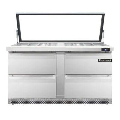 Master the art of cooking with the Continental Refrigerator SW60N24M-HGL-FB-D Refrigerated Counter, Mega Top Sandwich / Salad Unit. This top-of-the-line unit is designed to meet the demands of a busy commercial restaurant kitchen. With a spacious 17.0 cu ft capacity and two sections, it offers ample storage for all your ingredients. The unit comes with 24 1/6 size pans, each 4" deep, and an 8" cutting board, allowing you to easily assemble sandwiches and salads. The four drawers can accommodate a 12 x 20 x 6 pan each, giving you even more flexibility. Made in the USA, this unit features a stainless steel top, front, and end panels, as well as an aluminum back and interior, ensuring durability and easy cleaning. The electronic control with a digital display and hi-low alarm allows for precise temperature management, while the rear-mounted self-contained refrigeration system ensures efficient cooling. With its sleek design and reliable performance, the Continental Refrigerator SW60N24M-HGL-FB-D is the perfect addition to any commercial kitchen.