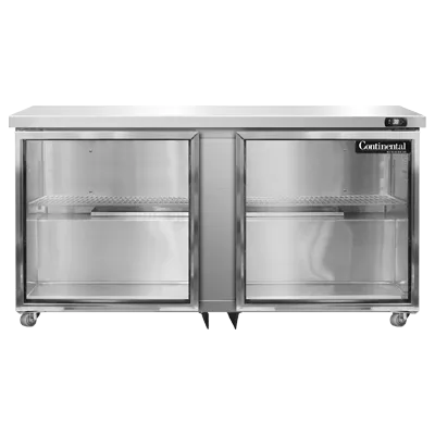 Introducing the Continental Refrigerator SW60NGD-U Undercounter Display Refrigerator, designed to drive restaurant profitability. This two-section refrigerator boasts a spacious 17.0 cu ft capacity, providing ample storage for your restaurant's perishable items. The two glass doors not only showcase your products but also make it easy to locate items quickly. With LED lighting, your products will be beautifully illuminated, enticing customers to make a purchase. The stainless steel front, top, and end panels ensure durability and a sleek appearance that complements any commercial kitchen. The aluminum interior is easy to clean and maintain, saving you valuable time. Equipped with a rear-mounted self-contained refrigeration system and electronic control with a digital display, this refrigerator offers precise temperature management and a hi-low alarm to ensure food safety. The SW60NGD-U also features 1-3/8" diameter plate casters for easy mobility. Made in the USA and certified by cETLus and NSF, this Continental Refrigerator is a reliable and efficient addition to any commercial restaurant.