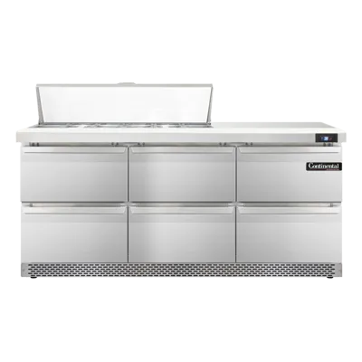 Empower your kitchen staff with the Continental Refrigerator SW72N12C-FB-D Refrigerated Counter, Sandwich / Salad Unit. This top-of-the-line unit is designed to meet the demands of a busy commercial restaurant. With a spacious 72" width and a 20.6 cu ft capacity, it provides ample storage space for all your ingredients. The unit features three sections, each equipped with 12 1/6 size x 4" deep pans and a 19" cutting board, allowing your staff to efficiently prepare sandwiches and salads. The six drawers are versatile, accommodating either a 12 x 18 x 6 pan or a combination of 1/2 x 6 and 1/3 x 6 pans. Made in the USA, this sandwich unit boasts a stainless steel top, front, and end panels, as well as an aluminum back and interior, ensuring durability and easy cleaning. The electronic control with a digital display and hi-low alarm provides precise temperature management, while the rear-mounted self-contained refrigeration system ensures optimal cooling. With 3-3/4" casters, this unit is easy to move and clean around. Trust Continental Refrigerator to deliver high-quality refrigeration solutions for your commercial kitchen.