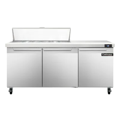 Enhance the heart of your restaurant with the Continental Refrigerator SW72N12C Refrigerated Counter, Sandwich / Salad Unit. This top-of-the-line unit is designed to meet the demands of a busy commercial kitchen. With a spacious 72" width and a generous 20.6 cu ft capacity, this three-section sandwich unit provides ample storage space for all your ingredients. The unit comes with twelve 1/6 size pans, each 4" deep, and a convenient 19" cutting board for easy food preparation. The stainless steel top, front, and end panels ensure durability and easy cleaning, while the aluminum back and interior provide excellent insulation. The electronic control with a digital display allows for precise temperature management, and the hi-low alarm alerts you if the temperature goes outside the desired range. With rear-mounted self-contained refrigeration and a 1/4 HP compressor, this unit is both efficient and reliable. Made in the USA and certified by cETLus and NSF, the Continental Refrigerator SW72N12C is the perfect addition to any commercial kitchen.
