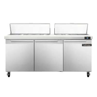 Revolutionize your cooking setup with the Continental Refrigerator SW72N18C Refrigerated Counter, Sandwich / Salad Unit. This top-of-the-line unit is designed to meet the demands of a busy commercial restaurant kitchen. With a spacious 72" width and a generous 20.6 cu ft capacity, this three-section sandwich unit provides ample storage space for all your ingredients. The unit comes with 18 1/6 size pans, each 4" deep, and a convenient 19" cutting board for easy food preparation. The stainless steel top, front, and end panels ensure durability and easy cleaning, while the aluminum back and interior provide excellent insulation. The electronic control with a digital display allows for precise temperature management, and the hi-low alarm ensures food safety. With rear-mounted self-contained refrigeration and a 1/4 HP compressor, this unit is both efficient and reliable. Made in the USA and certified by cETLus and NSF, the Continental Refrigerator SW72N18C is the perfect addition to any commercial kitchen.