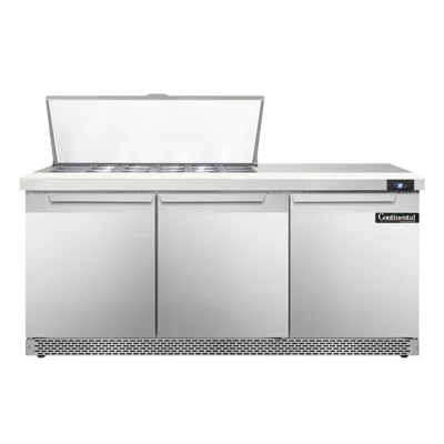 Craft culinary wonders with the Continental Refrigerator SW72N18M-FB Refrigerated Counter, Mega Top Sandwich / Salad Unit. This mighty top sandwich unit is designed to meet the demands of a busy commercial restaurant. With a spacious 72" width and a 20.6 cu ft capacity, it offers ample storage for all your ingredients. The unit features three sections, each equipped with 18 1/6 size x 4" deep pans and a convenient 10" cutting board, allowing you to easily assemble sandwiches and salads. The stainless steel top, front, and end panels ensure durability and easy cleaning, while the aluminum back and interior provide excellent insulation. The electronic control with a digital display allows for precise temperature management, and the hi-low alarm ensures food safety. With rear-mounted self-contained refrigeration and 3-3/4" casters, this unit is easy to move and position in your kitchen. Made in the USA and certified by cETLus and NSF, the Continental Refrigerator SW72N18M-FB is a reliable and efficient addition to any commercial kitchen.
