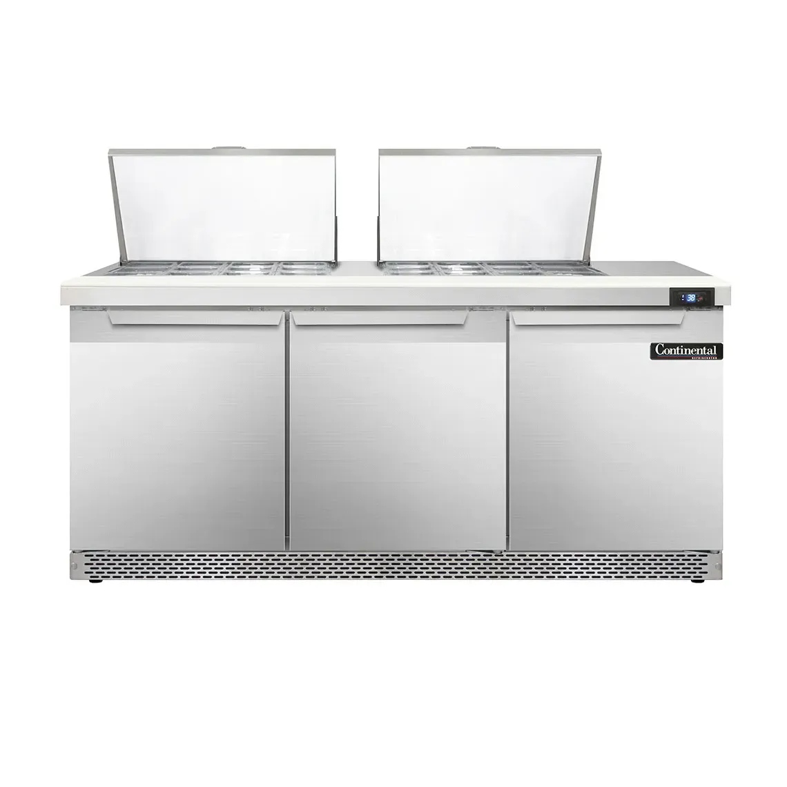 Transform your food service with the Continental Refrigerator SW72N24M-FB Refrigerated Counter, Mega Top Sandwich / Salad Unit. This powerful unit is designed to meet the demands of a commercial restaurant, offering a spacious 72" width and a generous 20.6 cu ft capacity. With three sections and 24 1/6 size pans, you'll have plenty of room to store and organize your ingredients. The unit also features a convenient 10" cutting board, allowing you to prep your sandwiches and salads with ease. The stainless steel top, front, and end panels ensure durability and easy cleaning, while the aluminum back and interior provide excellent insulation. The electronic control with a digital display allows for precise temperature management, and the hi-low alarm ensures that your food stays fresh and safe. With rear-mounted self-contained refrigeration and 3-3/4" casters, this unit is both efficient and mobile. Trust in the Continental Refrigerator SW72N24M-FB to elevate your restaurant's food preparation capabilities.