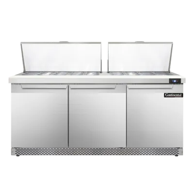 Introducing the Continental Refrigerator SW72N27M-FB Refrigerated Counter, Mega Top Sandwich/Salad Unit. Craft culinary wonders with this mighty top sandwich unit that is perfect for commercial restaurant use. With a spacious 72" width and a 20.6 cu ft capacity, this three-section unit provides ample storage for all your ingredients. It comes with (27) 1/6 size x 4" deep pans and a convenient 10" cutting board, allowing you to easily assemble sandwiches or salads. The stainless steel top, front, and end panels ensure durability and easy cleaning, while the aluminum back and interior provide excellent insulation. The electronic control with a digital display and hi-low alarm allows for precise temperature management. With rear-mounted self-contained refrigeration and 3-3/4" casters, this unit is easy to move and position in your kitchen. Made in the USA and certified by cETLus and NSF, the Continental Refrigerator SW72N27M-FB is a reliable and efficient addition to any commercial kitchen.