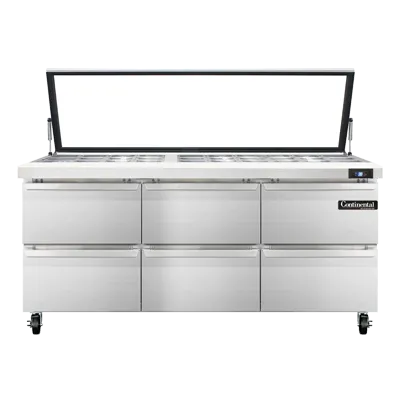 Ignite culinary passion with the Continental Refrigerator SW72N30M-HGL-D Refrigerated Counter, Mega Top Sandwich / Salad Unit. This powerful unit is designed to meet the demands of a busy commercial restaurant, offering a spacious 72" width and a generous 20.6 cu ft capacity. With its three-section design, it provides ample storage for all your ingredients and toppings. The unit features a hinged glass lid, allowing for easy access and visibility of your sandwich and salad ingredients. It also includes (30) 1/6 size pans with a 4" depth and an 8" cutting board for convenient food preparation. The six drawers can accommodate (1) 12 x 18 x 6 pan per drawer or (1) 1/2 x 6 & (1) 1/3 x 6 pans per drawer. Made in the USA, this unit boasts a stainless steel top, front, and end panels, as well as an aluminum back and interior for durability. The electronic control with a digital display ensures precise temperature management, while the hi-low alarm alerts you to any fluctuations. With rear-mounted self-contained refrigeration and a 1/4 HP compressor, this unit is both efficient and reliable. Trust Continental Refrigerator to deliver exceptional quality and performance for your commercial kitchen.