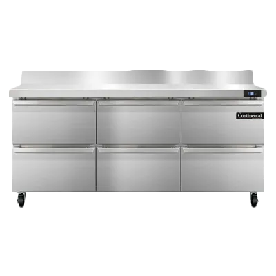 Enhance the heart of your restaurant with the Continental Refrigerator SW72NBS-D Refrigerated Counter. This work top refrigerator is designed to meet the demands of a busy commercial kitchen. With a spacious 72" width and a generous 20.6 cu ft capacity, it provides ample storage space for all your ingredients and supplies. The three-section design includes six drawers, each capable of accommodating a 12 x 18 x 6 pan or a combination of 1/2 x 6 and 1/3 x 6 pans. The stainless steel top with a 5-1/2" backsplash ensures durability and easy cleaning, while the stainless steel front and end panels add a sleek and professional look to your kitchen. The electronic control with a digital display allows for precise temperature management, and the hi-low alarm ensures food safety. Made in the USA, this work top refrigerator is cETLus and NSF certified, guaranteeing its quality and reliability. Upgrade your restaurant's efficiency and productivity with the Continental Refrigerator SW72NBS-D Refrigerated Counter.