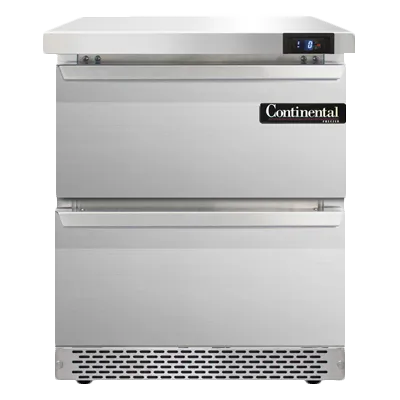 Mobilize your kitchen with the Continental Refrigerator SWF27N-FB-D Freezer Counter. This work top freezer is designed to meet the demands of a commercial restaurant, offering a convenient and efficient solution for storing and accessing frozen ingredients. With a 7.4 cu ft capacity and two drawers, this one-section freezer can accommodate a 12 x 20 x 6 pan per drawer (supplied by others), allowing for easy organization and access to your frozen goods. The stainless steel flat top provides a durable and easy-to-clean surface, while the stainless steel front and end panels add a sleek and professional look to your kitchen. The aluminum interior ensures optimal temperature retention, while the electronic control with digital display and hi-low alarm provide precise temperature management and peace of mind. With rear mounted self-contained refrigeration and 3-3/4" casters, this freezer counter is easy to move and position in your kitchen. Made in the USA and certified by cETLus and NSF, you can trust the quality and reliability of Continental Refrigerator. Upgrade your kitchen with the Continental Refrigerator SWF27N-FB-D Freezer Counter and experience the convenience and efficiency it brings to your commercial restaurant.
