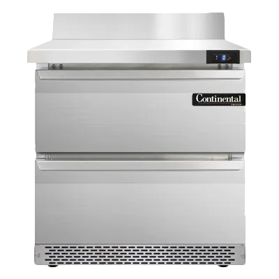 Enhance your commercial kitchen with the Continental Refrigerator SWF32NBS-FB-D Freezer Counter. This work top freezer is designed to meet the demands of a busy restaurant environment. With a 9.0 cu ft capacity and a one-section design, it provides ample storage space for your frozen ingredients. The stainless steel top features a 5-1/2"H backsplash, ensuring easy cleaning and preventing spills from reaching the floor. The two drawers are capable of accommodating either a 12 x 20 x 6 pan or a 1/2 x 6 pan and two 1/3 x 6 pans, giving you flexibility in organizing your ingredients. The stainless steel front and end panels not only add durability but also enhance the overall aesthetic of your kitchen. With an electronic control and digital display, you can easily monitor and adjust the temperature to ensure your ingredients stay fresh. The hi-low alarm alerts you if the temperature goes outside the desired range. The rear mounted self-contained refrigeration system with R290 Hydrocarbon refrigerant ensures efficient cooling while minimizing environmental impact. With a 1/3 HP compressor, this freezer counter is powerful enough to meet the demands of a commercial kitchen. The 3-3/4" casters make it easy to move and clean around the unit. Made in the USA, this Continental Refrigerator SWF32NBS-FB-D Freezer Counter is cETLus and NSF certified, guaranteeing its quality and safety. Upgrade your kitchen with this reliable and efficient freezer counter.