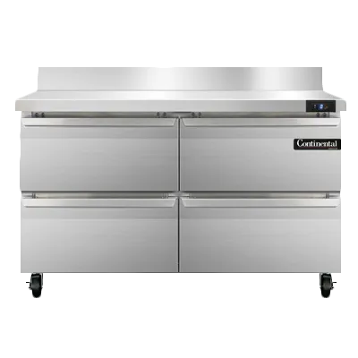 Introducing the Continental Refrigerator SWF48NBS-D Freezer Counter, Work Top - the perfect solution to simplify restaurant operations. With its 48"W size and 13.4 cu ft capacity, this two-section work top freezer offers ample space to store and organize your ingredients. The stainless steel top with a 5-1/2"H backsplash provides a durable and easy-to-clean surface, while the four drawers allow for convenient access to your items. Each drawer can accommodate either a 12 x 18 x 6 pan or a combination of a 1/2 x 6 pan and a 1/3 x 6 pan. The electronic control with a digital display and hi-low alarm ensures precise temperature management and alerts you of any fluctuations. Made in the USA, this freezer counter is built to last and is NSF and cETLus certified. Simplify your restaurant operations with the Continental Refrigerator SWF48NBS-D Freezer Counter, Work Top.
