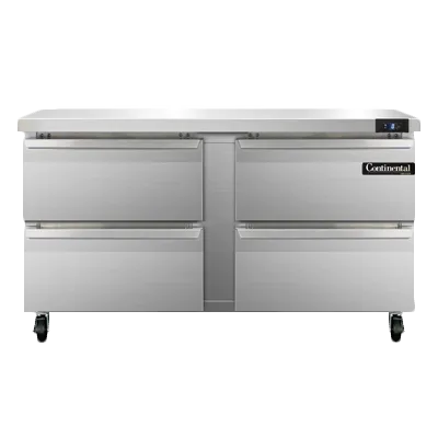 Craft culinary wonders with the Continental Refrigerator SWF60N-D Freezer Counter. This work top freezer is designed to meet the demands of a busy commercial restaurant kitchen. With a spacious 60" width and a generous 17.0 cu ft capacity, this two-section freezer provides ample storage space for all your ingredients and prepared dishes. The stainless steel flat top not only offers a durable and easy-to-clean surface but also serves as a convenient workspace. The four drawers are designed to accommodate a 12 x 20 x 6 pan each, allowing for efficient organization and easy access to your ingredients. The electronic control with a digital display ensures precise temperature management, while the hi-low alarm alerts you to any fluctuations. Made in the USA and certified by cETLus and NSF, this freezer counter is a reliable and high-quality addition to any commercial kitchen.